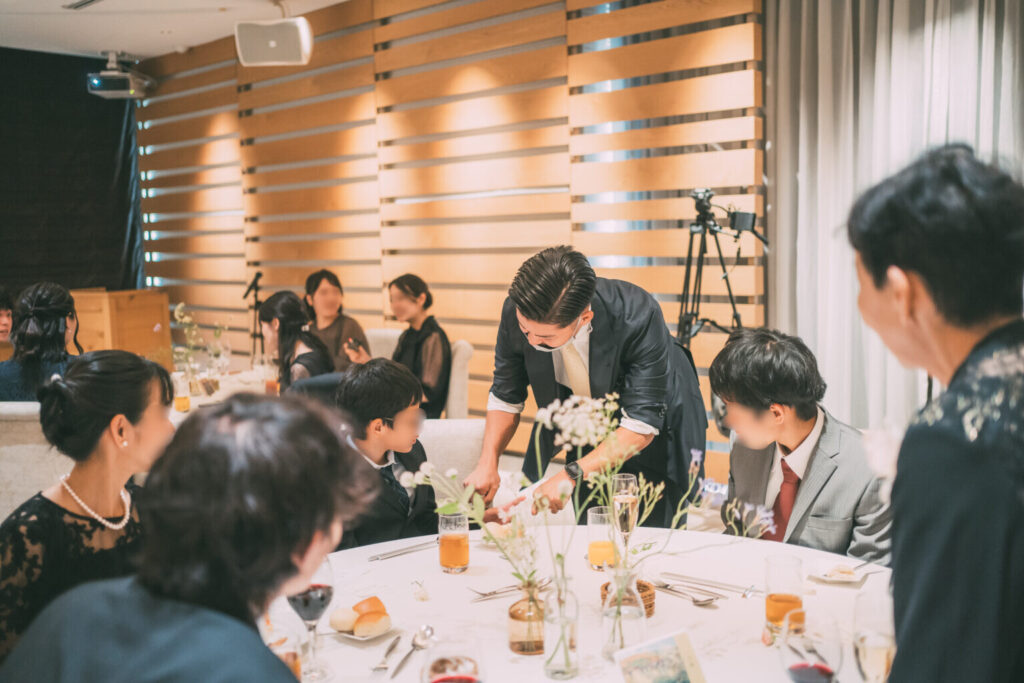 マジックは、主に 新郎新婦のお色直しや迎賓のタイミング で実施されています。ふたりが席を外している間は、どうしても会場の熱量が落ちやすい時間帯ですが、その間にマジシャンが各卓を回り、ゲストひとりひとりの目の前でマジックを披露します。