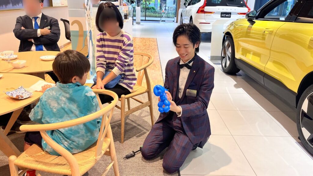 短い時間で驚きが起きるマジックを中心に 演じていきました。お子さま向けにはバルーンアートも用意し、